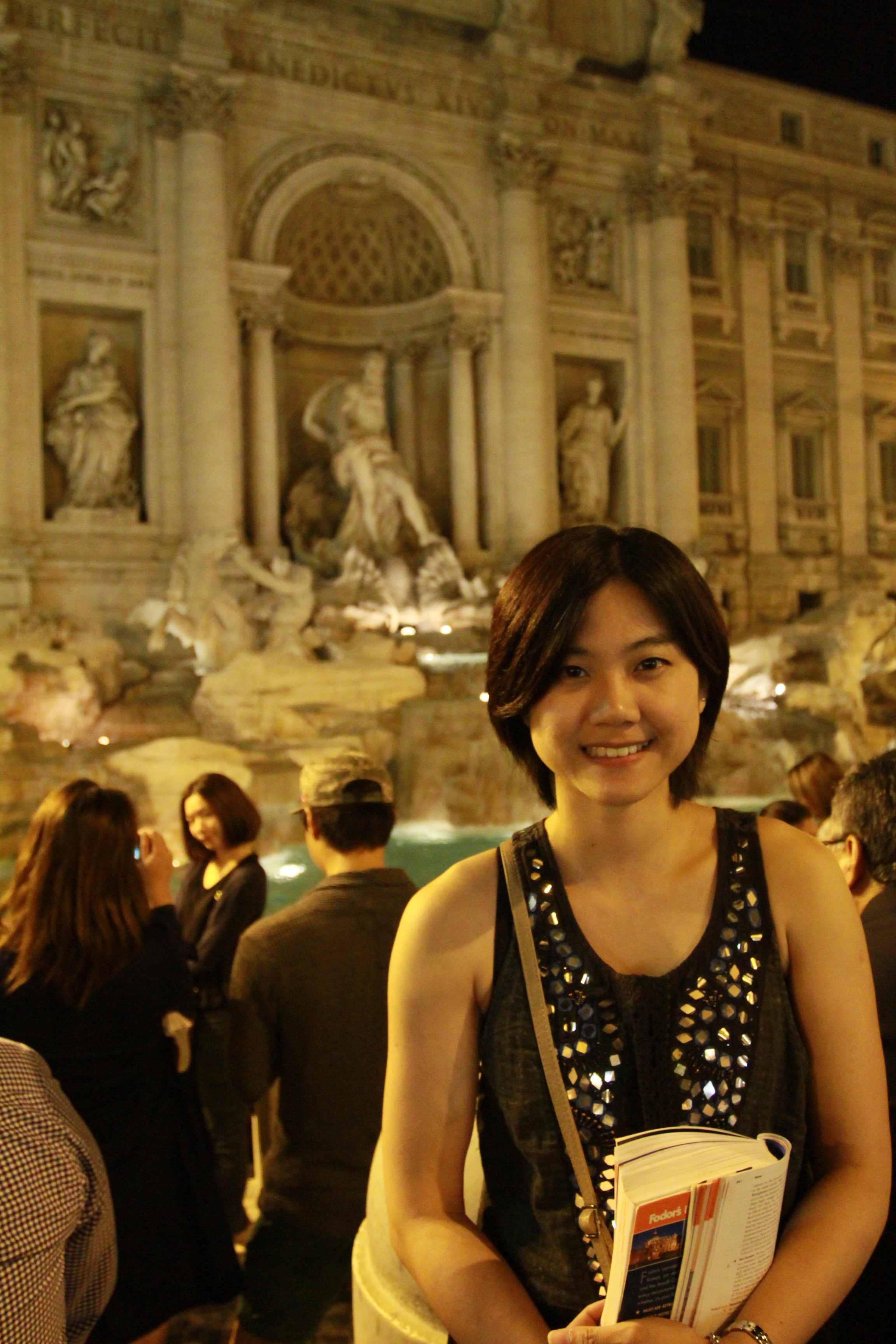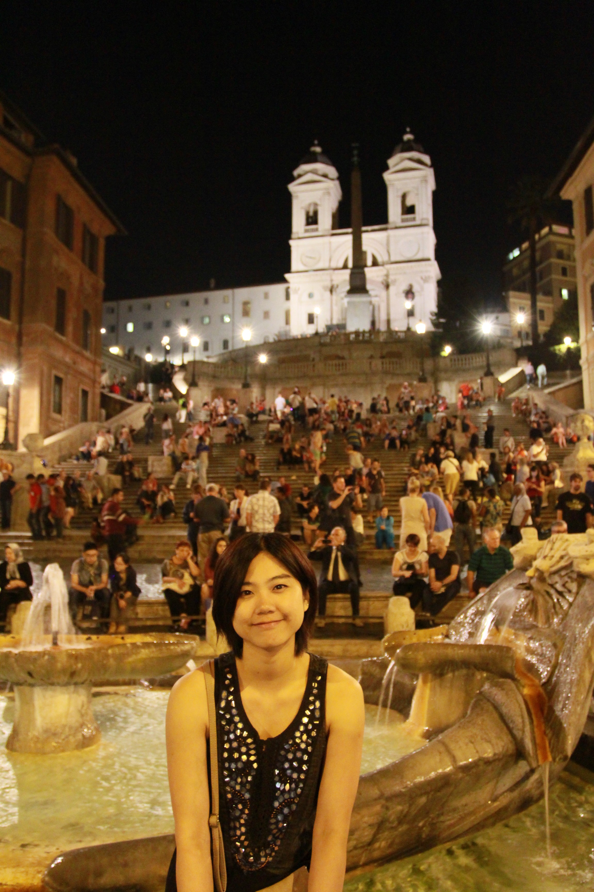 小坐片刻後,我們繼續走,去到著名的許願池Trevi Fountain,噴水池背面有很美麗的雕刻,全是神話人物及巨海洋生物,在燈光的照射下,十分浪漫。那裡堆滿了人,我們找了個位置拍照,突然有一個看上去似印度裔的男人,他拿著很多玫瑰花,他向我們講了很多美言,說我們可以隨意付多少錢便多少錢,我們付了他一歐元,他看到我們付得少,便將原本的3枝玫瑰,取回兩支,剩下了一枝給我們,我們也沒好氣,拿了一枝玫瑰便走,我們當然很後悔被他騙了錢,除了我們之外,還有其他人被他們包圍著買花,十分無奈。